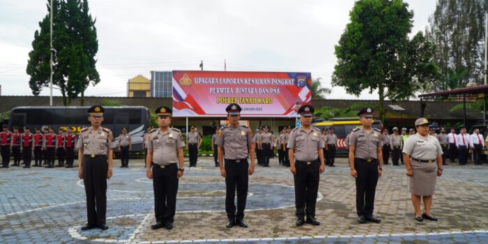 Rimbunnews.com –  Karo – Polres Tanah Karo menggelar upacara kenaikan pangkat, di halaman Mapolres Tanah Karo, Minggu(31/12/2023). Pada upacara ini, dipimpin langsung oleh Kapolres Tanah Karo AKBP Wahyudi Rahman, S.H, S.I.K, M.M, CPHR, CBA, yang diikuti oleh seluruh jajaran.