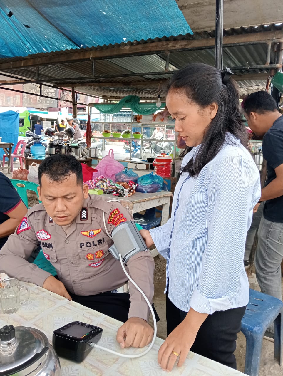 Pelayanan yang dilakukan meliputi pengecekan suhu badan, pengecekan tensi, pemberian obat, cairan anti masuk angin dan multivitamin.