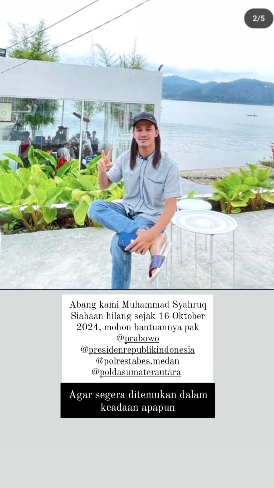 Ibu dan pihak keluarga beserta Kerabat MUHAMMAD SYAHRUD SIAHAAN Memohon kepada bapak Prabowo Presiden RI, Kapolda Sumatera Utara, Kapolrestabes Medan, pihak Pemerintahan dan masyarakat memohon bantuan mencari Anak kami yang hilang bernama “MUHAMMAD SYAHRUQ SIAHAAN” ciri – ciri nya rambut panjang lurus sedikit ikal, menggunakan jaket hitam bertuliskan ORAIMO dan menggunakan Celana Hitam dan pakek kereta vario. Alamat Rumah Jalan PWS Gg buntu, kelurahan Sei Putih Tim II, Kecamatan Medan Petisah.