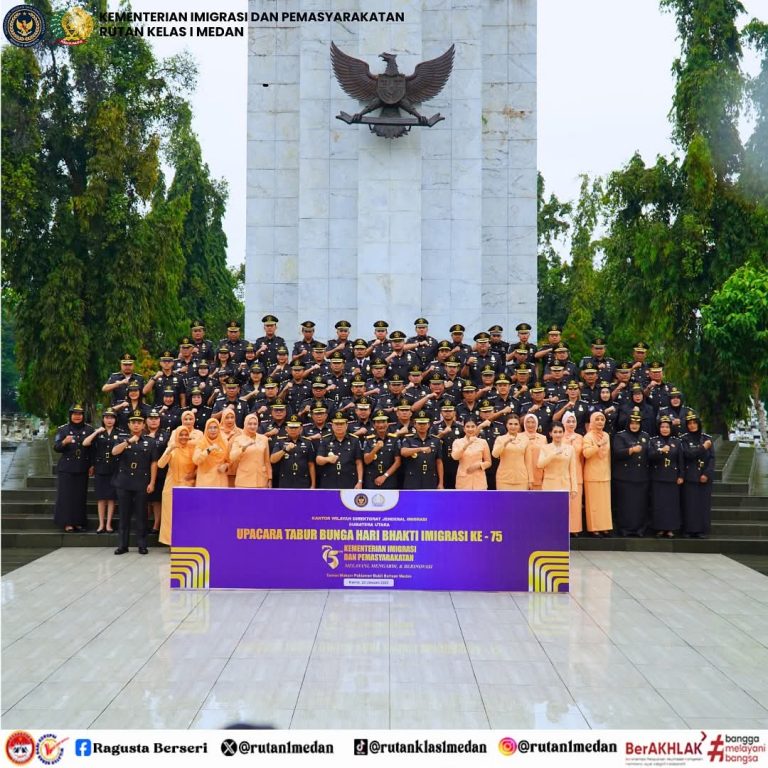 Rimbunnews.com – Medan – Rumah Tahanan Negara (Rutan) Kelas I Medan Direktorat Jenderal Pemasyarakatan (Ditjenpas) Sumatera Utara, ikuti upacara sekaligus tabur bunga di Taman Makam Pahlawan (TMP) Bukit Barisan Medan yang merupakan serangkaian kegiatan dalam rangka memperingati hari bhakti imigrasi ke-75 tahun 2025,