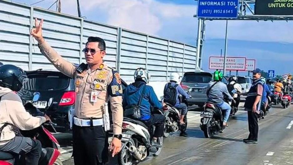“Ini karena keadaan darurat yang seharusnya tidak boleh motor masuk tol. Namun, karena polisi sayang masyarakat, kita kasih akses,” kata AKP Sandy di hadapan pemotor.