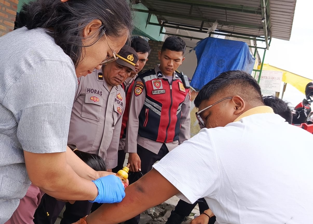 Menyaksikan kejadian tersebut, personel Pos Pelayanan segera mengamankan lokasi dan membawa korban ke tepi jalan. Danru Pos Pelayanan Simpang 4 HKBP Bolon Operasi Ketupat Toba 2025, Bripka Andre Marbun, langsung memanggil tim medis untuk memberikan penanganan awal.