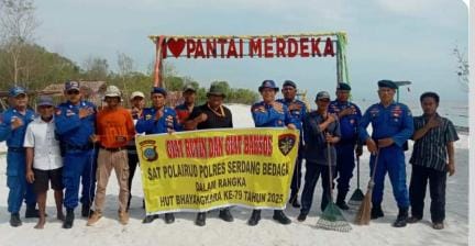 Rimbunnews.com – Sebagai bentuk kepedulian terhadap kebersihan lingkungan daerah pesisir, Satuan Kepolisian Perairan dan Udara (Sat Polairud) Polres Serdang Bedagai (Sergai) menggelar kegiatan bakti sosial dengan bergotong royong di Desa Bagan Kuala, Kecamatan Tanjung Beringin, Kamis pagi (12/6/2025).