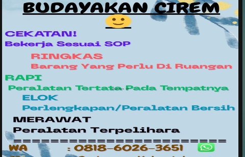 Inovasi Cirem (Cekatan, rIngkas, Rapi, Elok, Merawat) merupakan Inovasi Puskesmas Kabanjahe yang dilaksanakan pada Tahun 2025. Dengan adanya Inovasi Cirem diharapkan dapat membudayakan dan membiasakan bekerja sesuai dengan SOP dan mengembangkan perilaku kerja pegawai yang positif ditempat kerja sebuah kebiasaan yang disiplin, Memisahkan segala sesuatu barang yang benar- benar diperlukan dan menyingkirkan yang tidak diperlukan di tempat kerja,