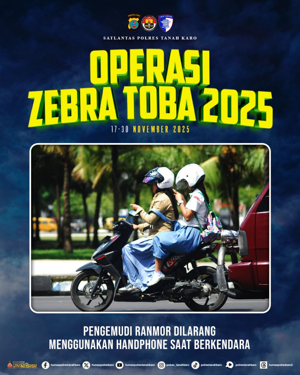Rimbunnews.com – Karo – Polres Tanah Karo mengimbau seluruh pengendara untuk selalu mengutamakan keselamatan saat berlalu lintas. Dalam pelaksanaan Operasi Zebra Toba 2025, setiap pengendara dilarang menggunakan atau memainkan telepon genggam (hape) saat berkendara. Tindakan ini sangat berbahaya karena dapat mengurangi konsentrasi dan memicu kecelakaan di jalan raya.