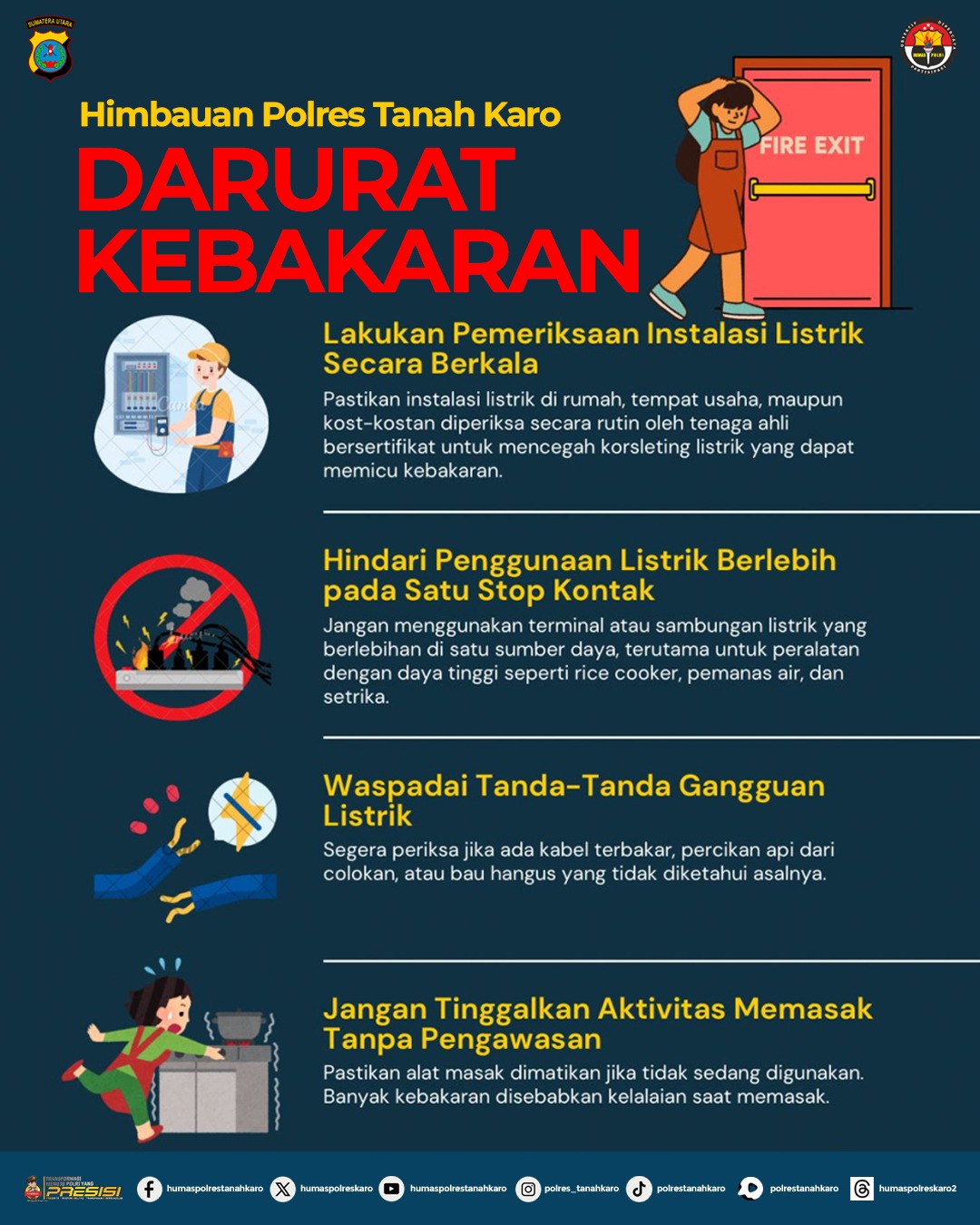 Rimbunnews.com – Karo – Dalam upaya mencegah terjadinya kebakaran, Polres Tanah Karo menghimbauan kepada seluruh masyarakat agar meningkatkan kewaspadaan terhadap potensi bahaya kebakaran, khususnya yang disebabkan oleh kelalaian dan gangguan instalasi listrik.