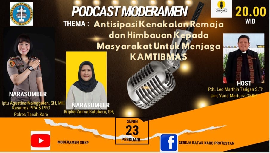 Hal tersebut disampaikan dalam rangka partisipasi Polres Tanah Karo pada kegiatan Podcast Moderamen yang diselenggarakan oleh Gereja Batak Karo Protestan (GBKP) dan disiarkan melalui kanal YouTube serta Facebook GBKP.