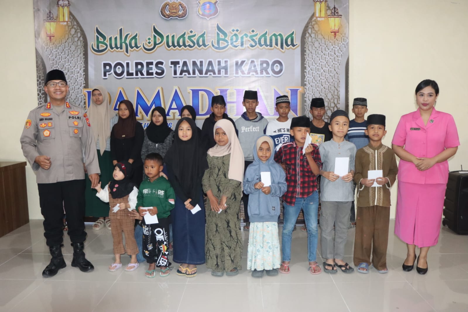 Dalam kesempatan tersebut, Kapolres Tanah Karo AKBP Pebriandi Haloho secara langsung menyerahkan santunan kepada anak yatim piatu yang berasal dari Kecamatan Kabanjahe. Suasana haru dan penuh kebersamaan terasa saat anak-anak menerima bantuan sebagai bentuk kepedulian dan kasih sayang di bulan yang penuh berkah.