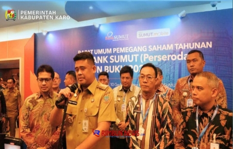 Rimbunnews.com Medan – Bupati Karo, Brigjen Pol (Purn.) Dr. dr. Antonius Ginting, Sp.OG., M.Kes., didampingi Kepala Badan Keuangan dan Aset Daerah (BKAD) Kabupaten Karo, Sri Harmonista Br Kaban, ST, M.Eng., menghadiri Rapat Umum Pemegang Saham (RUPS) Tahunan Tahun Buku 2025 PT Bank Sumut yang digelar pada Senin (6/4/2026) di Aula Kantor Pusat Bank Sumut, Medan.
